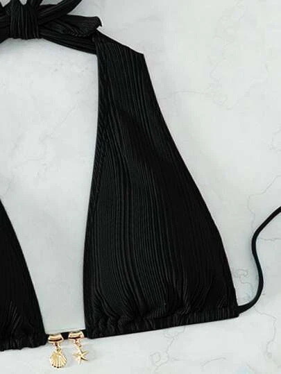 Textured Fake Pearls Decor Halter Triangle Bra & Thong Bottom 2 Piece Bathing Suit