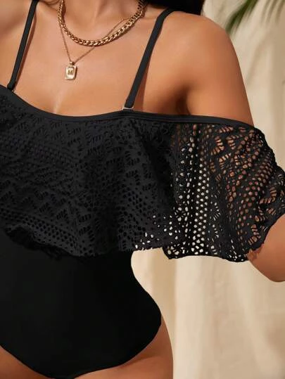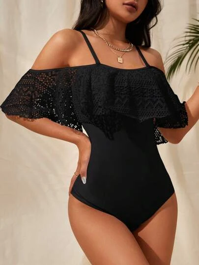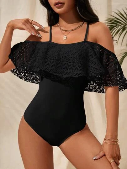 Be the first to review “Contrast Lace Ruffle Trim Cold Shoulder One Piece Swimsuit” Cancel reply