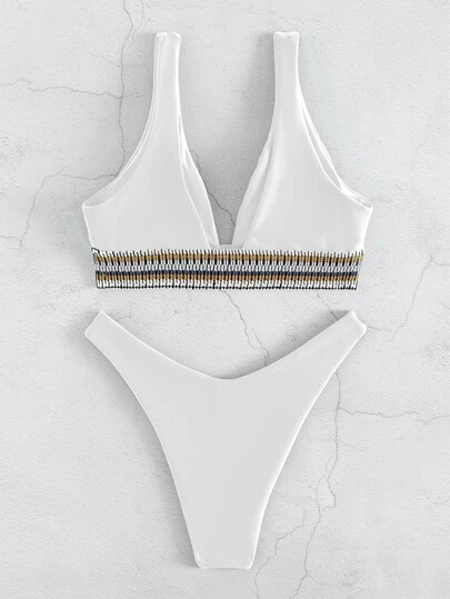 Textured Fake Pearls Decor Halter Triangle Bra & Thong Bottom 2 Piece Bathing Suit