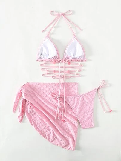 Be the first to review “Floral Flocked Bikini Set Flower Beaded Halter Triangle Bra & Tie Side Bottom & Beach Skirt 3 Piece Bathing Suit” Cancel reply
