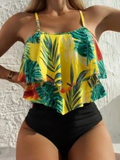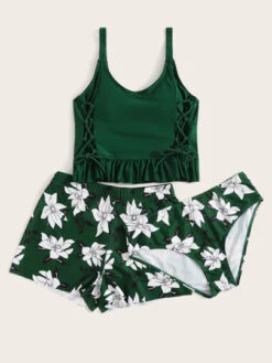 Floral Tankini Set Ruffle Hem Lace Up Cami Top & High Waisted Bottom & Shorts 3 Piece Bathing Suit