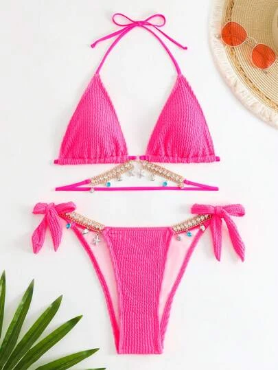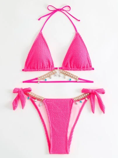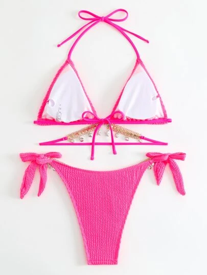 Be the first to review “Textured Bikini Set Rhinestone Chain Decor Triangle Bra Top & Tie Side Bikini Bottom 2 Piece Swimsuit” Cancel reply