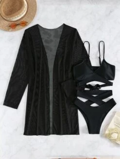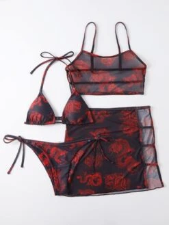 4pack Halter Bikini Swimsuit With Dragon Print Mesh Cover Up