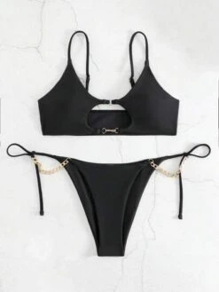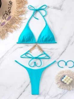 Bikinx Solid Bikini Set Halter Triangle Bra & Beaded Thong Bottom 2 Piece Swimsuit