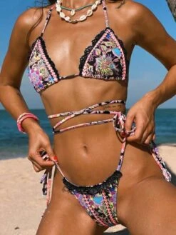 Bikinx Floral Print Frill Trim Halter Triangle Bikini Swimsuit