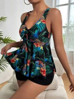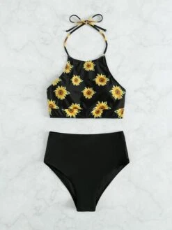 Sunflower Print Tankini Set High Neck Halter Top & High Waist Bikini 2 Piece Swimsuit