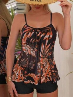 Tropical Print Tankini Set Push Up Underwire Swim Cami Top & Shorts 2 Piece Bathing Suit